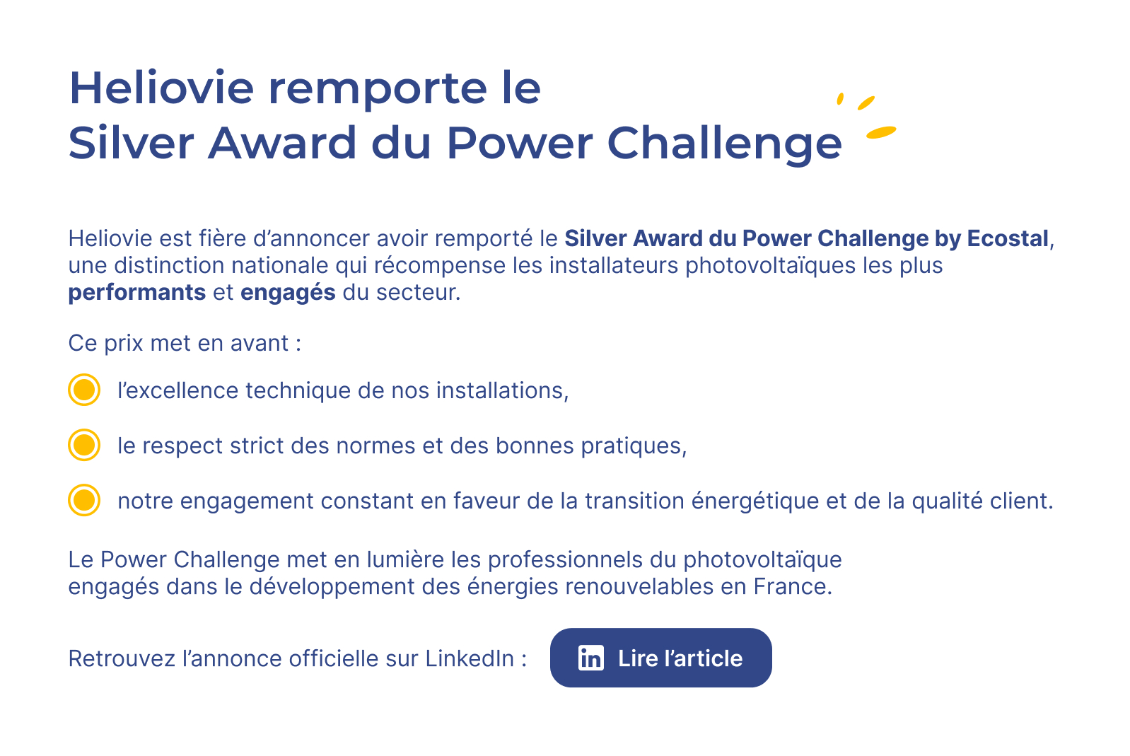Heliovie est fière d’annoncer avoir remporté le Silver Award du Power Challenge by Ecostal, une distinction nationale qui récompense les installateurs photovoltaïques les plus performants et engagés du secteur. Le Power Challenge met en lumière les professionnels du photovoltaïque engagés dans le développement des énergies renouvelables en France.